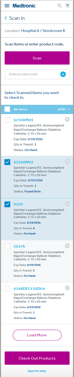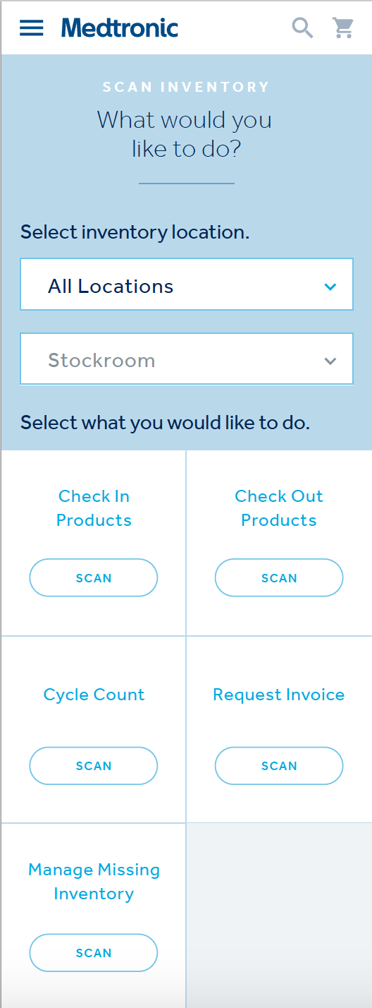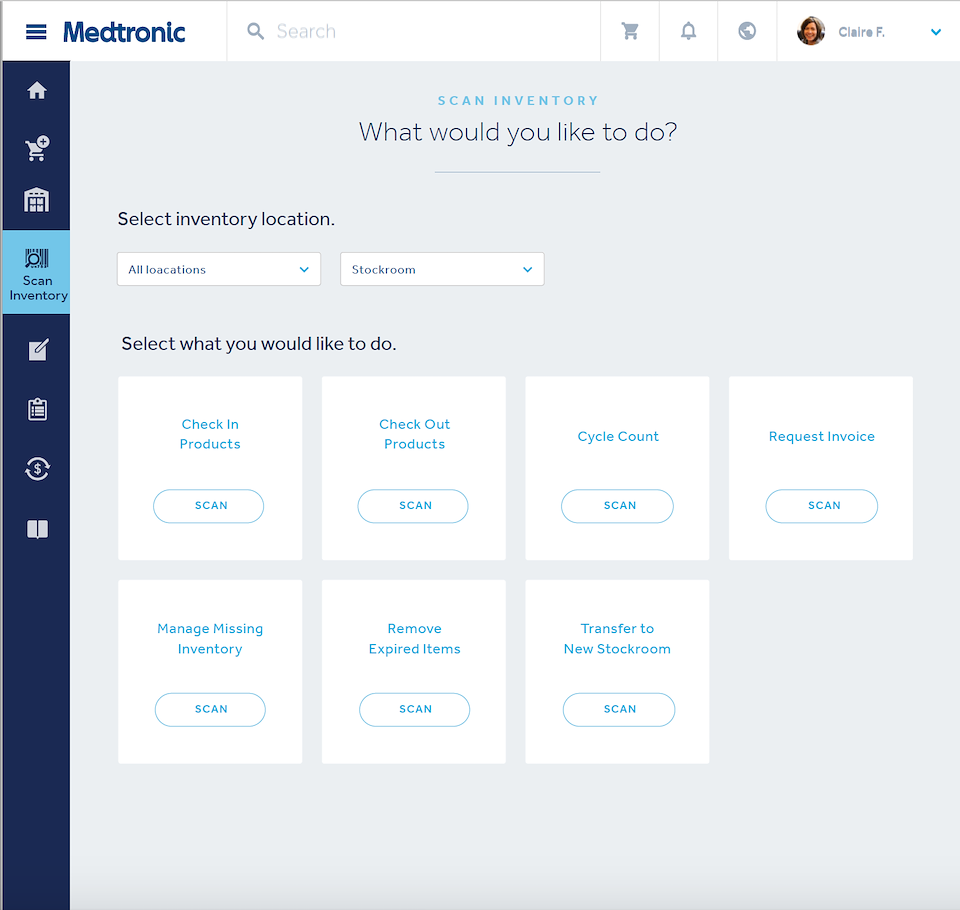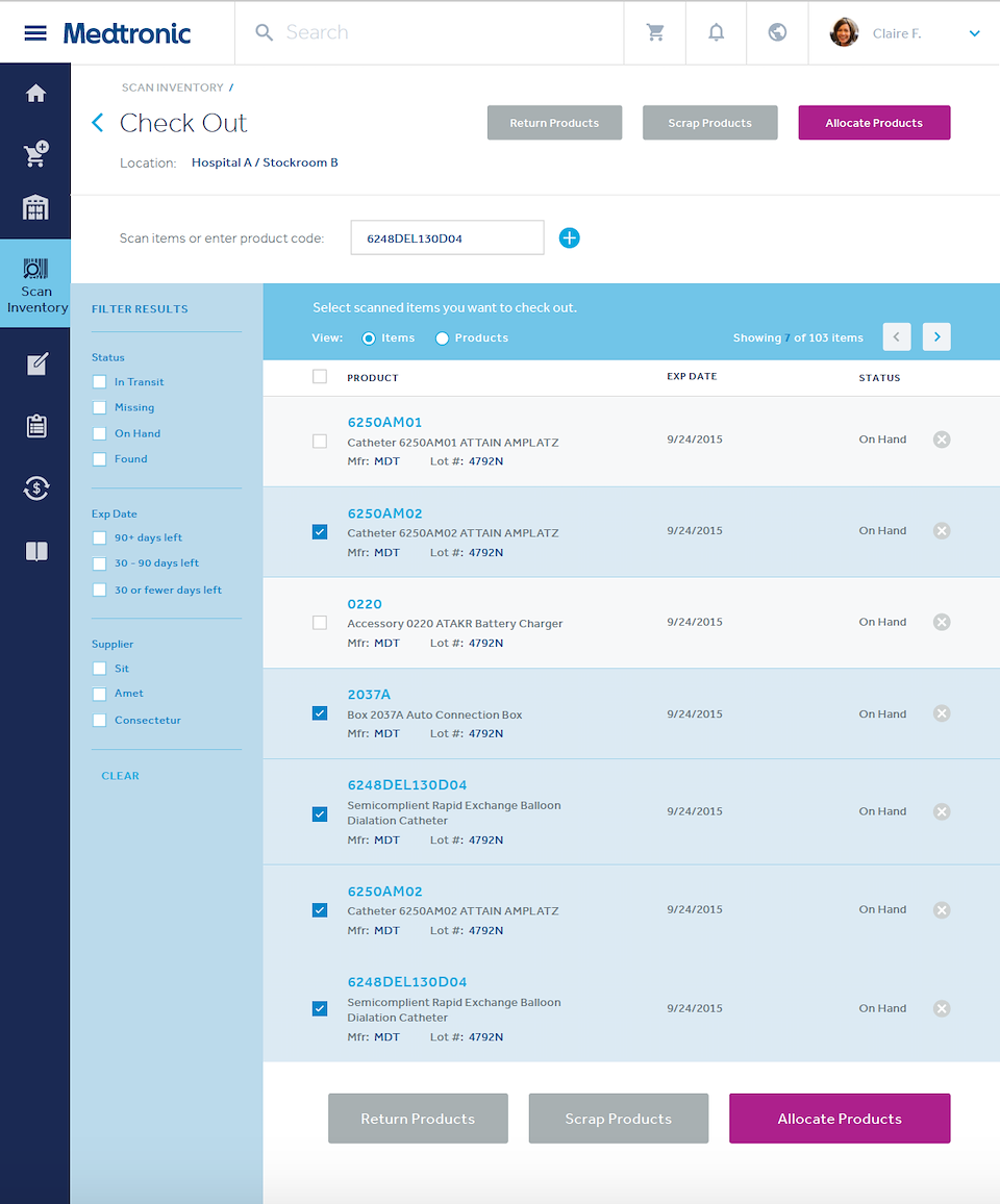 Utilizing in person workshops, interviews with subject matter experts and doctors performing the surgeries, content audits across multiple internal systems, and creating an seemingly ever growing list of user journeys, we managed to make everything happen within a fairly simple UI and even managed to include a barcode scanner to eliminate the need for manual entry on inventory intake and checkout.